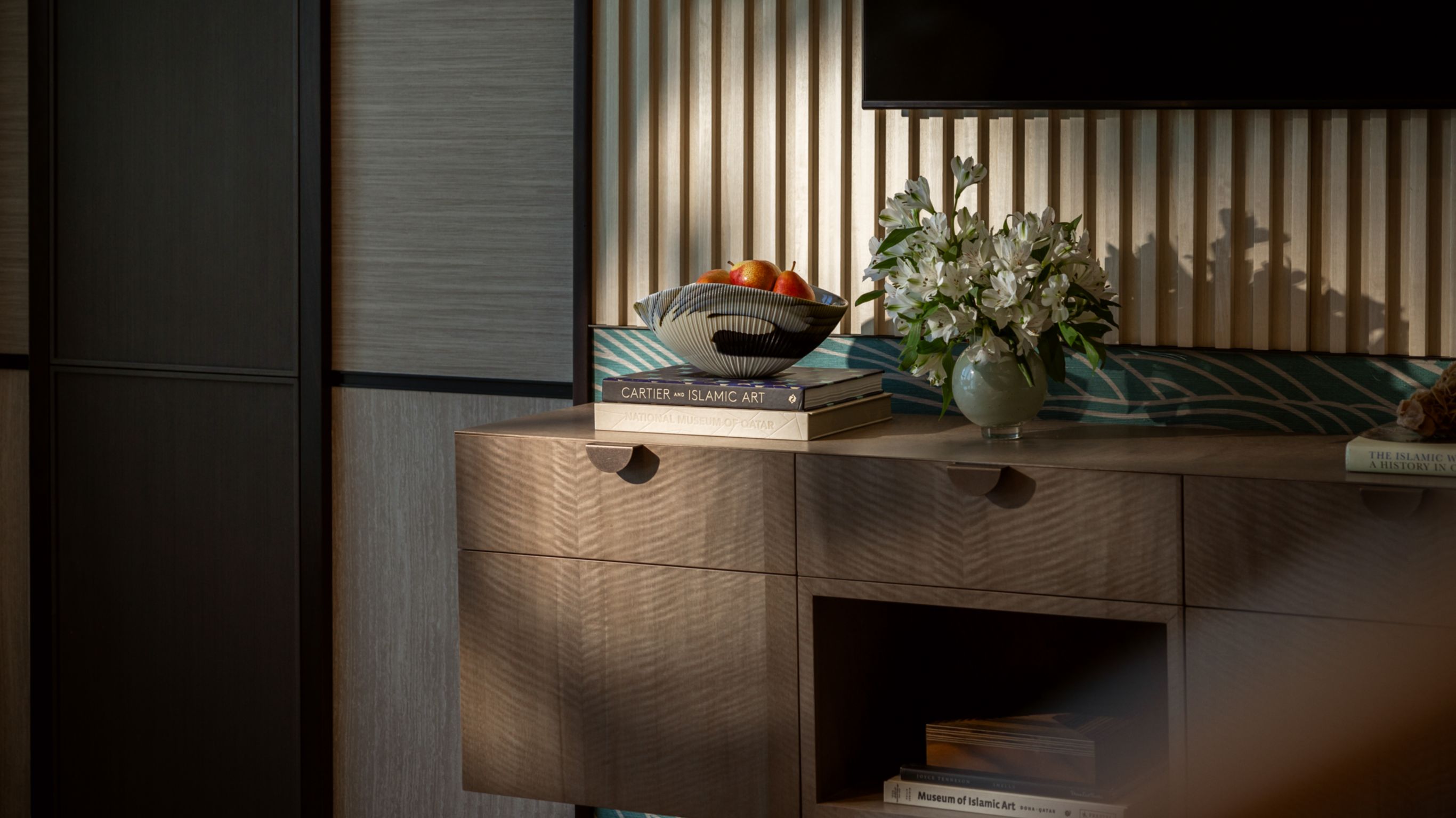 The Three-Bedroom Residence is the ultimate expression of the estate-in-the-sky concept, richly decorated with a blend of Qatari heritage and contemporary design. In addition to the magnificent living area, enhanced by its mesmerizing views of the Arabian Gulf or the Lusail skyline, the 177 sq.m. (1,905 sq.ft.) residence features a separate dining room with seating for eight; a state-of-the-art kitchen, and a master suite with a walk-in wardrobe, dual vanity, rain shower, and soaking tub. Two additional bedrooms (one king, one twin) feature ensuite bathrooms; the additional helper bedroom is also ensuite.