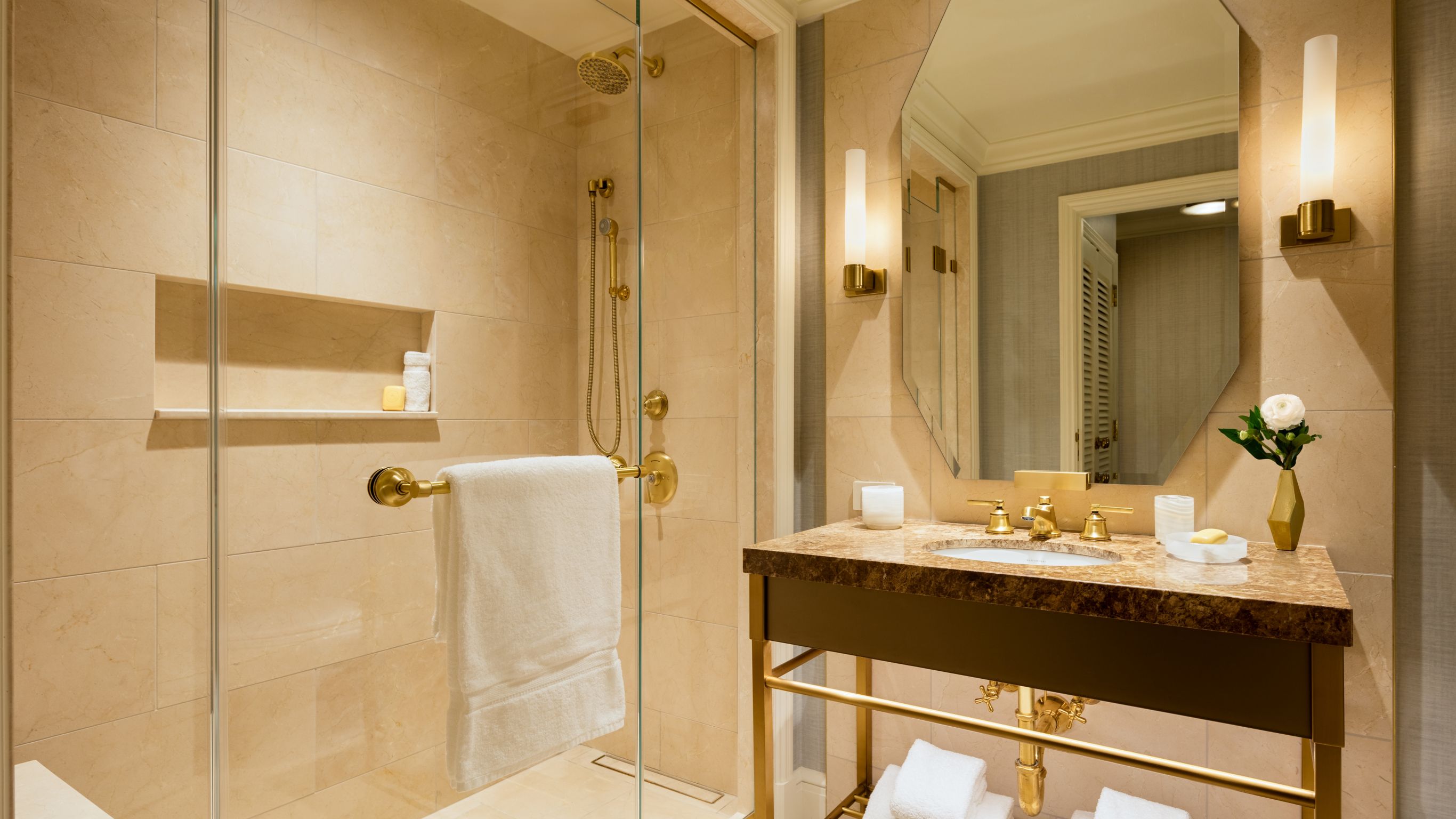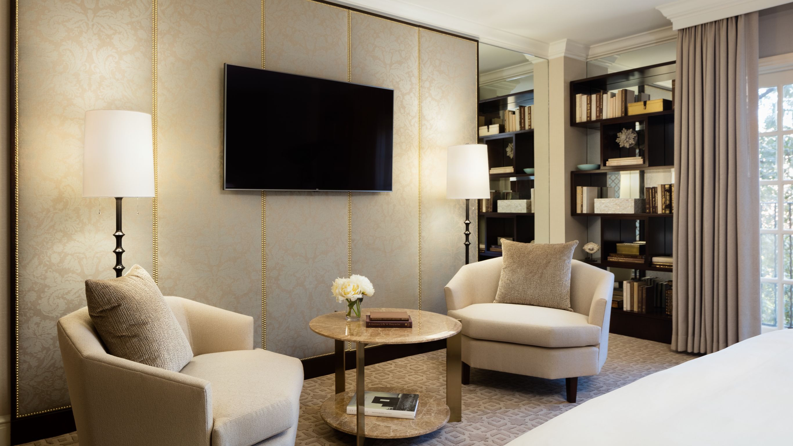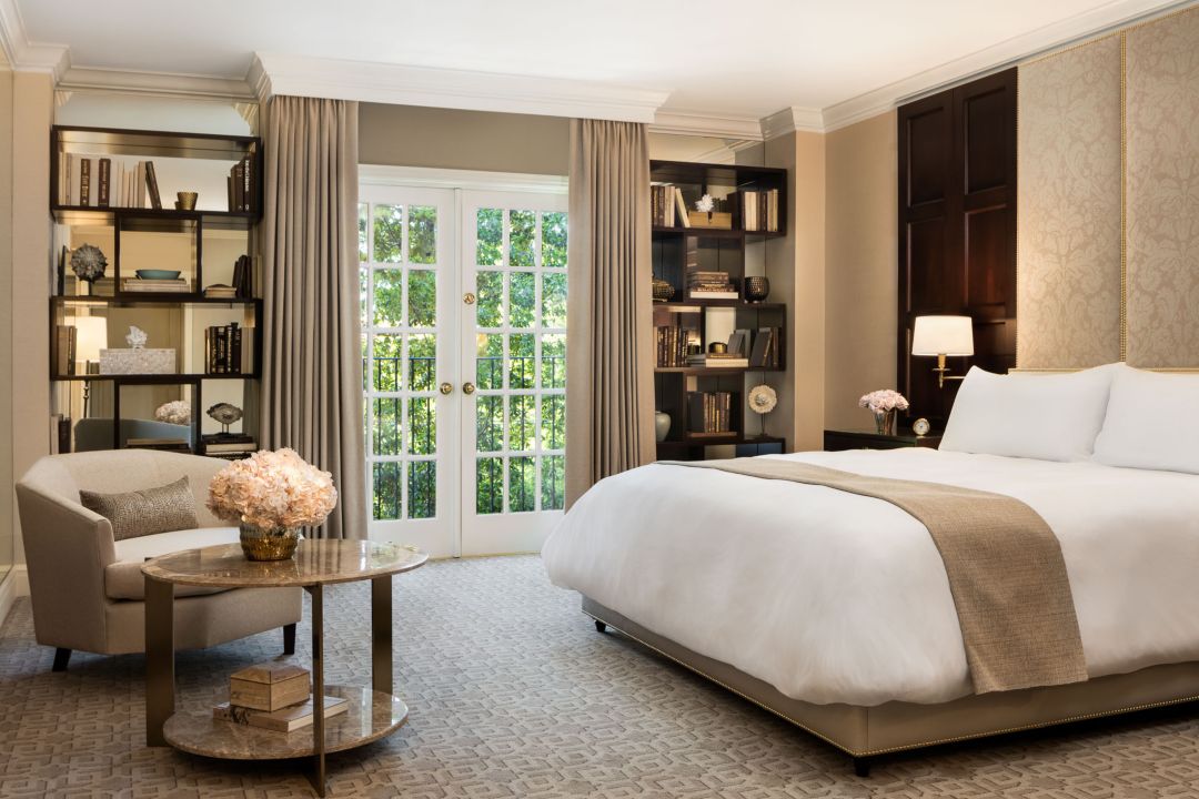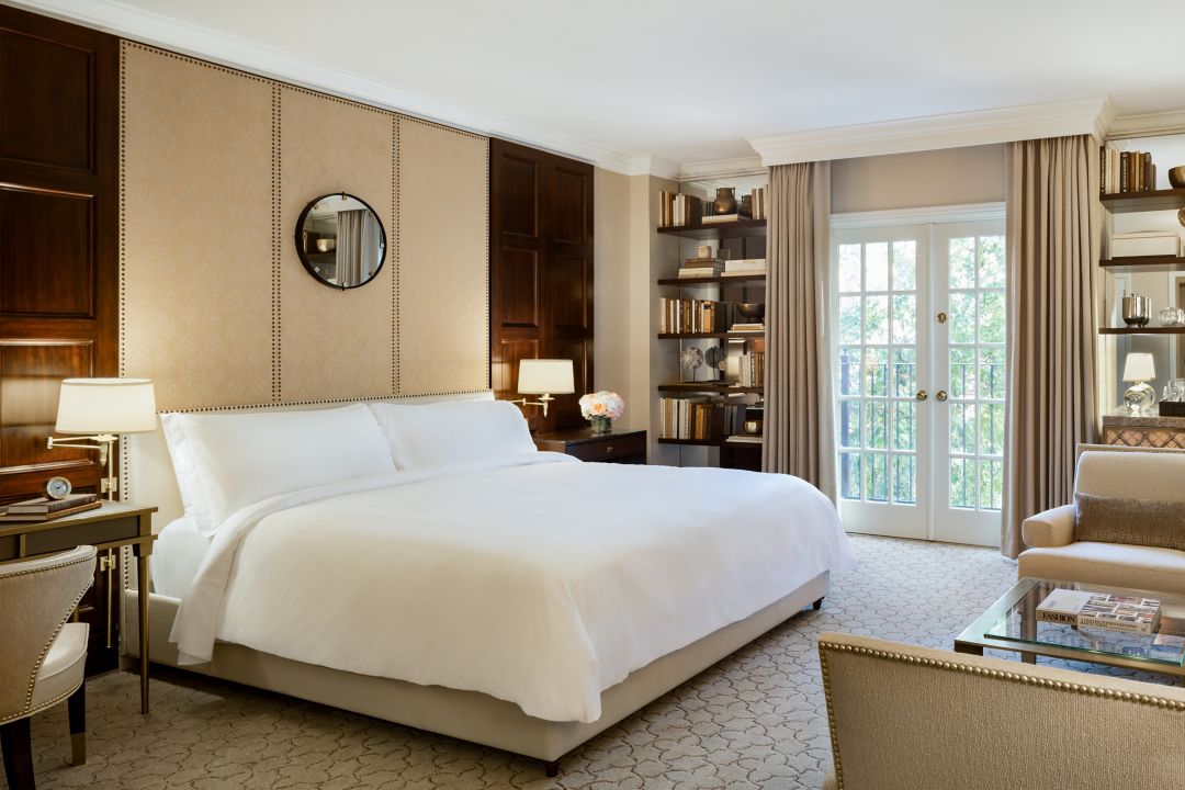 Offering a choice of a king or two queen beds, the Deluxe Room features a sitting area, writing desk, French doors that open to a petite balcony and an airy bathroom with elegant Waterworks fixtures and an oversized walk-in shower.