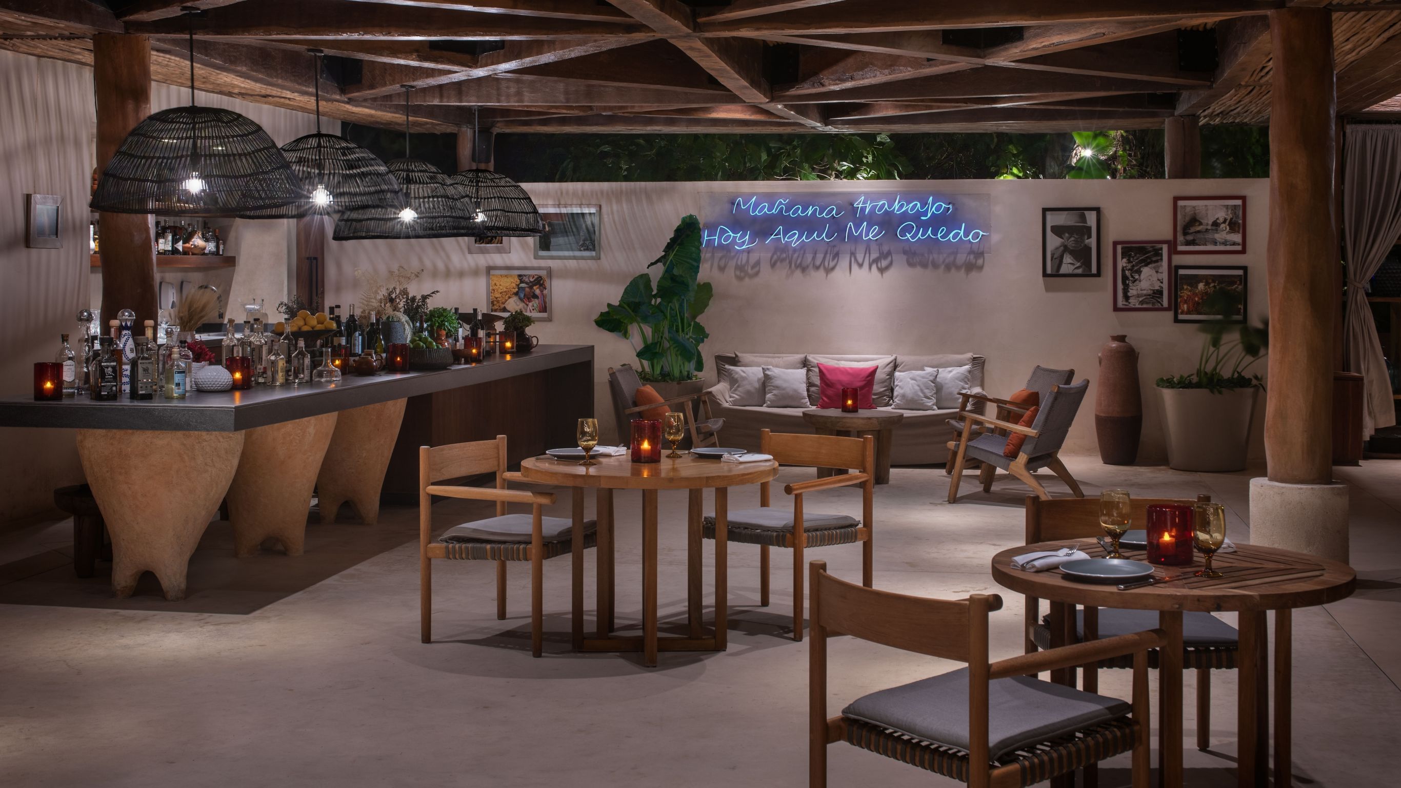 El lugar cuenta con varias salas de estar, La Cantina, un camión de comida estilo retro que opera como restaurante y bar de servicio completo, tres piscinas profundas y una fogata. La Palapa es el espacio para eventos más exclusivo de Aquí me quedo y es extremadamente versátil. El techo de paja y las vistas directas del mar caribeño crean un ambiente tranquilo y acogedor para los huéspedes mientras comen, bailan y celebran.